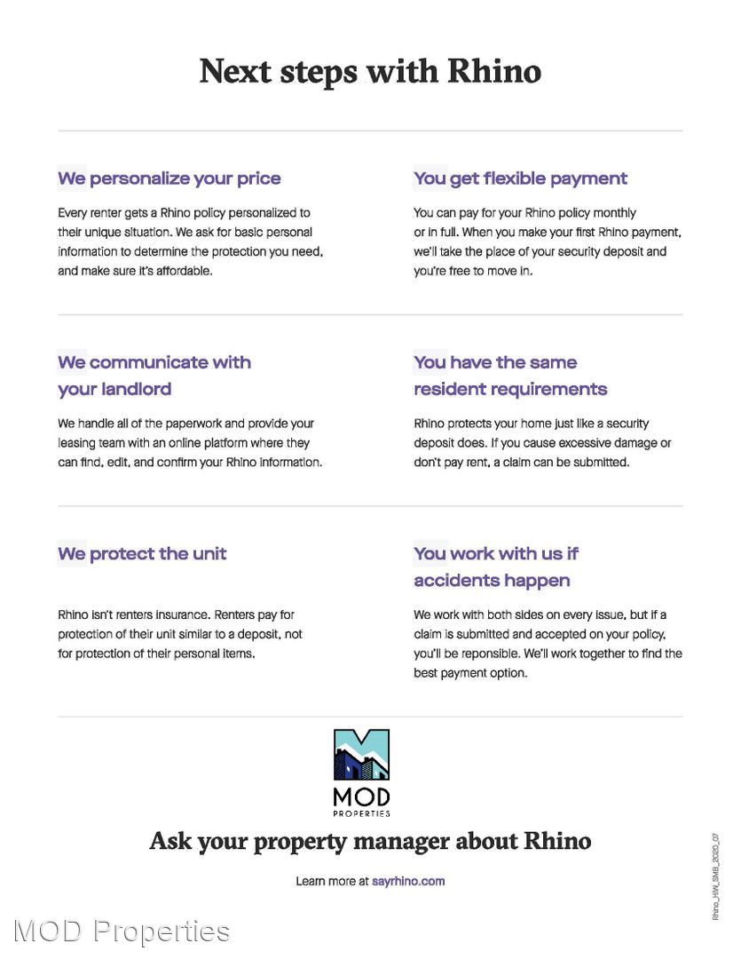 This unit offers reduced upfront costs with Rhino. Ask us how you can save cash on the deposit requirements when you move in. If you opt out of this program our standard deposit is equivalent to one full month of rent.