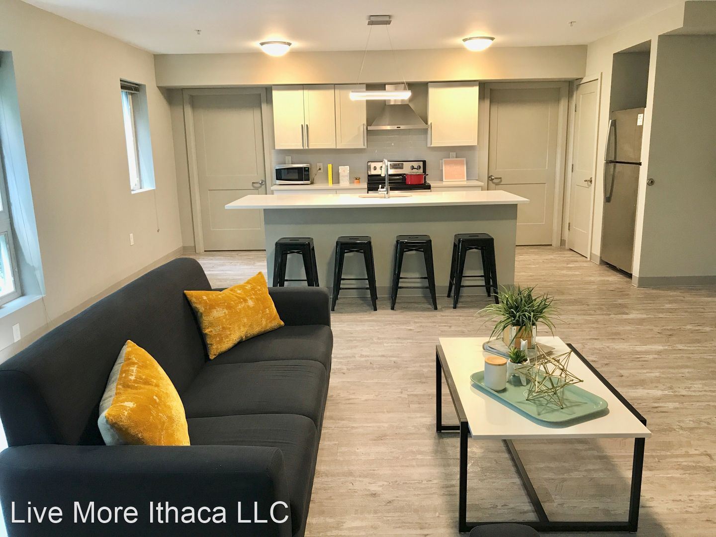 Our pet-friendly apartments come fully furnished and include a full XL bed frame and mattress, armoire, desk, and chair, under bed storage in each bedroom. In the common area, we include, a couch, loveseat and/or armchair, coffee table, bar stools, and a mounted smart TV. All appliances are included including a dishwasher and an in-unit washer and dryer.